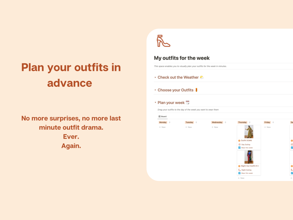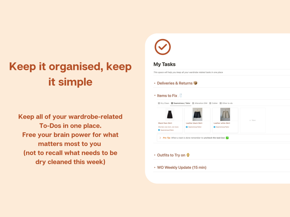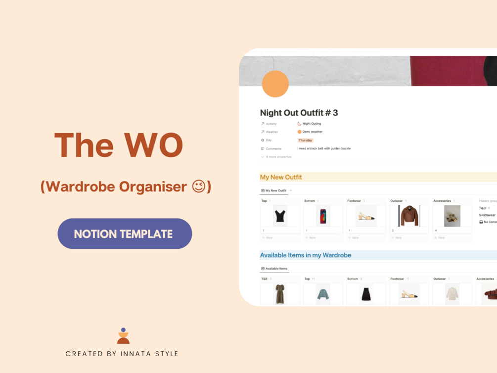 The Wardrobe Organizer isnāt your typical Notion template. With custom coding based on feedback from my early users, the Wardrobe Organizer you see today is complex on the back end so that it is simple and intuitive for you to use. Here are some cool features built into the Wardrobe Organizer.