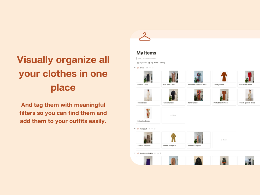 Views: The Wardrobe Organizer uses all the power of Notion views including tables, lists, calendars, and galleries.